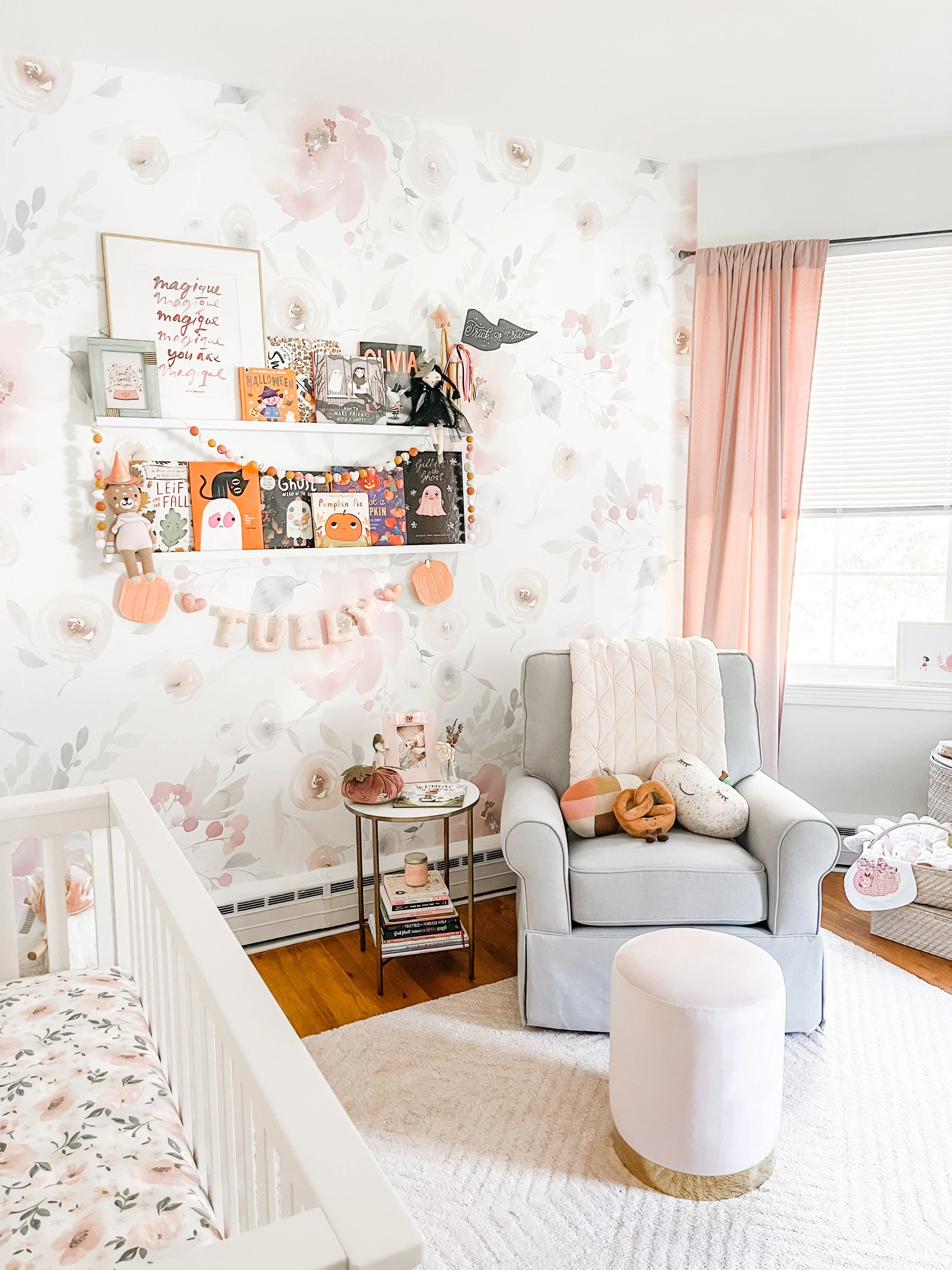 Pumpkin Garland by pearlandjane : Etsy | Pink Velvet Pumpkins: Target | Cassandra Witch Plush Doll: honeybug | Velvet Magic Wand: Anthropologie | Trick or Treat Party Pennant: Cami Monet | Violet the Fawn: Cuddle + Kind | Pastel Halloween Mini Witch Hat: Meri Meri | Custom Name Banner by OhHoneyChildCo: Etsy